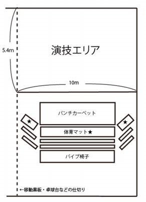 基本的に平土間(舞台と段差のないフラットな空間)で上演。